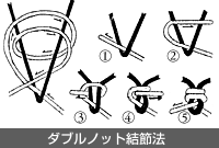 刺網なら強引に糸で縛って穴をふさいでしまってもよいのですが、投網となると広がらなくなるのでそうもいきません。しかし、ちょっとした破れぐらいならご自分で直されるようになればこの上ないことです。最初のスタートは本目結びで止めておいて、2個所目、3個所目はシングルノットないしはダブルノットで結んでいきます。糸が1〜1.5号ぐらいではシングルノットで、2号以上は結び目が滑りやすいのでダブルノットを使用します。